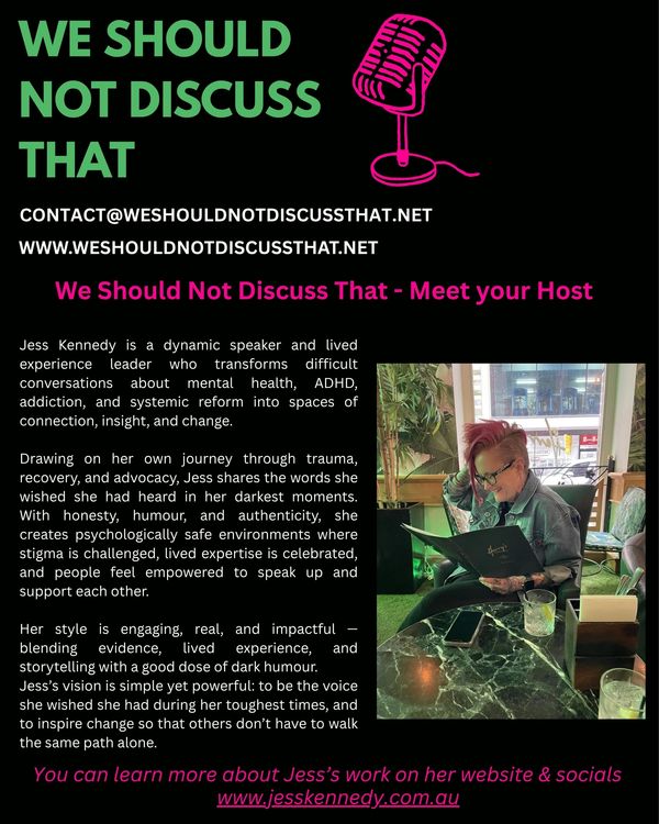 Jess Kennedy is a lived experience workplace trainer who uses her unique style and life experiences to create mentally safe, engaging, and interactive workshops. She educates organisations on Mental Health, ADHD, Workplace Health & Safety (with a focus on psychological safety), Trauma-Informed Care, and more—helping workplaces build awareness, empathy, and lasting cultural change.