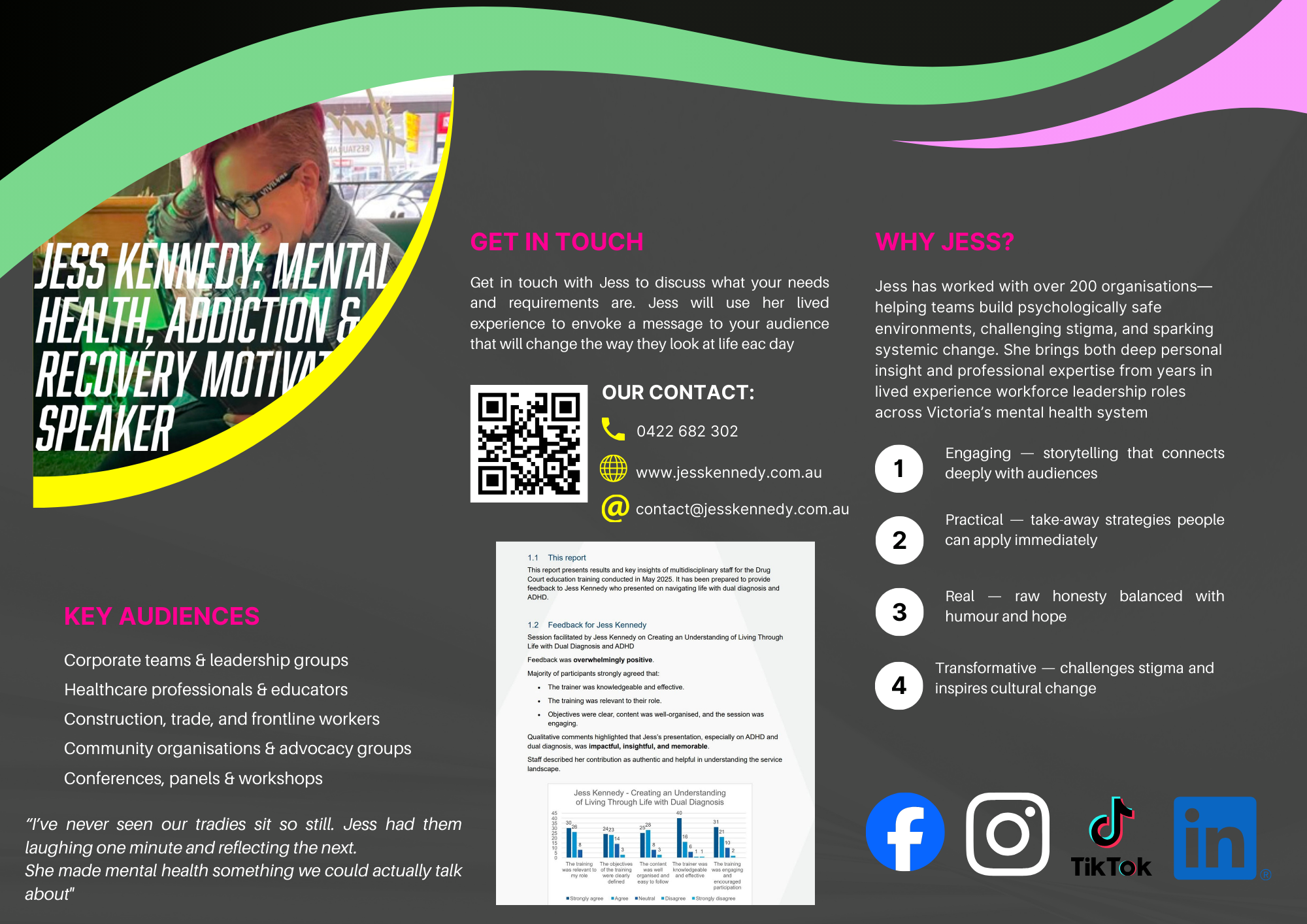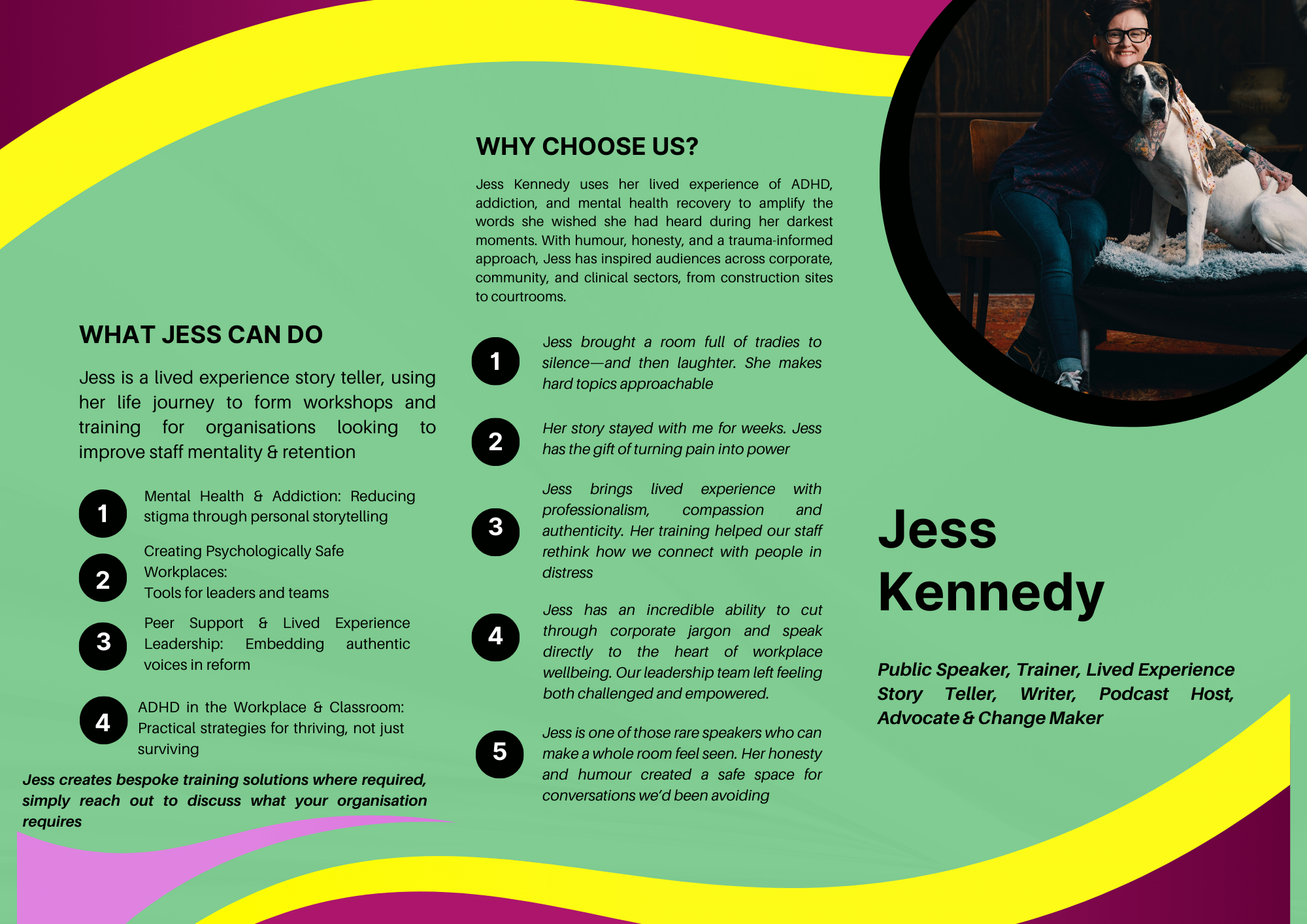 Jess Kennedy is a lived experience workplace trainer who uses her unique style and life experiences to create mentally safe, engaging, and interactive workshops. She educates organisations on Mental Health, ADHD, Workplace Health & Safety (with a focus on psychological safety), Trauma-Informed Care, and more—helping workplaces build awareness, empathy, and lasting cultural change.